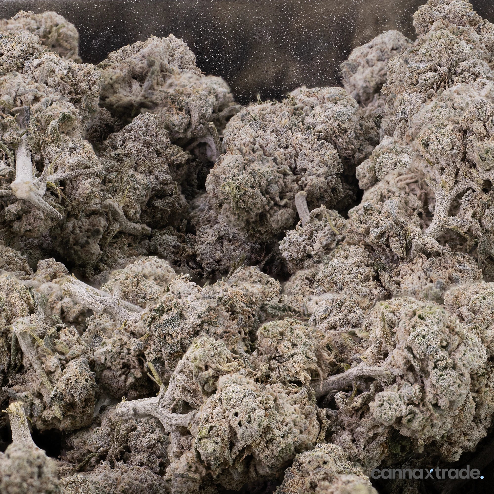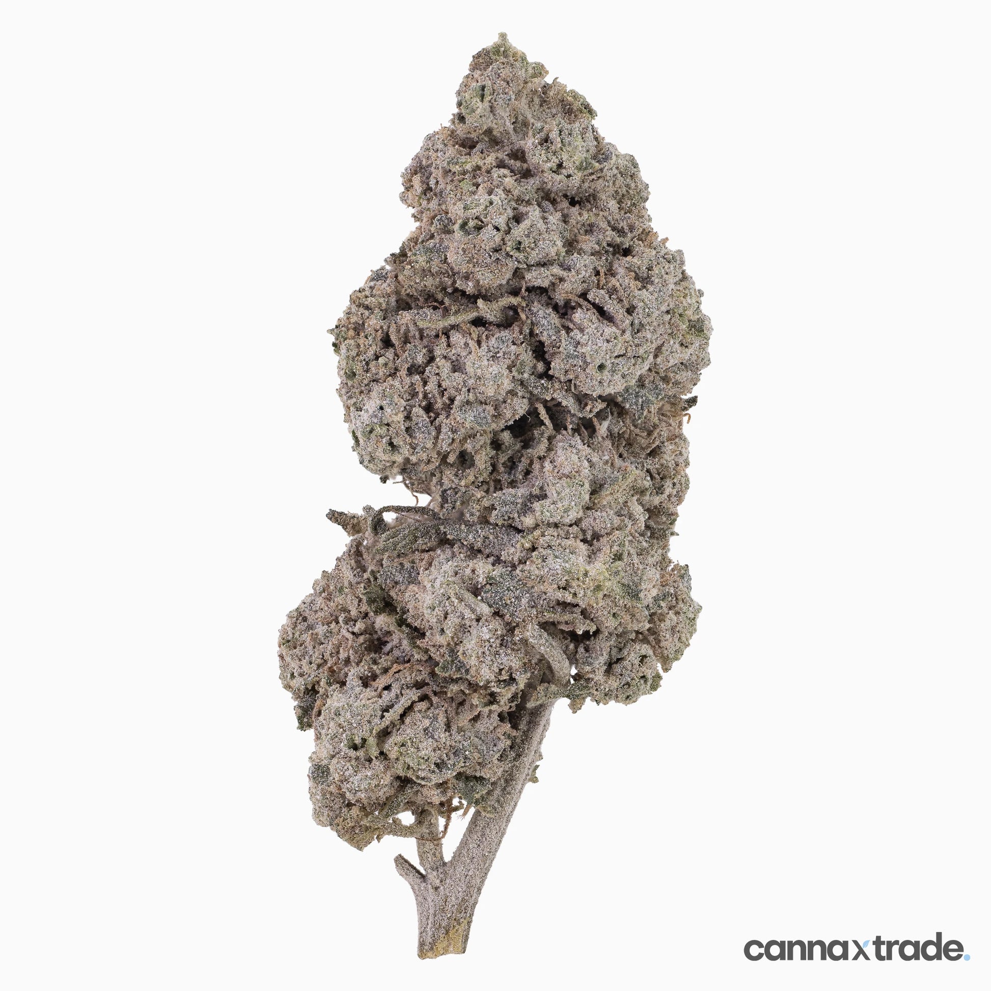 Bubblegum 25 is a THCA-coated, medium-dense bud with a layered, slightly tapered structure and a muted purple-grey coloration. Its surface is covered in fine crystalline THCA, giving it a frosty, sugar-dusted look, while the curled bracts and subtle green undertones create a softly textured, visually balanced appearance.